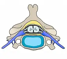 - une kinésiopathologie vertébrale[2], c'est-à-dire une diminution des amplitudes de mouvement entre deux segments vertébraux adjacents, ou une aberration de la mobilité de ces deux vertèbres ; une mobilité non fluide et saccadée à ce niveau lors de la flexion axiale du rachis par exemple ;