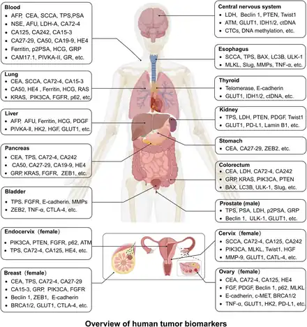 Les biomarqueurs sont désignés comme « une molécule biologique présente dans le sang, d’autres fluides corporels ou des tissus qui est le signe d’un processus normal ou anormal, ou d’un état ou d’une maladie. Un biomarqueur peut être utilisé pour mesurer la réponse à un traitement pour une maladie ou une affection , selon le National Cancer Institut National du Cancer des USA. Les biomarqueurs tumoraux existent dans les tissus tumoraux ou les fluides corporels tels que le sang, l'urine, les selles, la salive, et sont produits par la tumeur ou par la réponse du corps à la tumeur[1]. L'objectif du domaine des biomarqueurs tumoraux est de développer des biomarqueurs sensibles, spécifiques, fiables, des stratégies de détection et de surveillance rentables, reproductibles et puissantes pour l'indication du risque tumoral, la surveillance des tumeurs et la classification des tumeurs afin que les patients puissent recevoir le traitement le plus approprié et que les médecins puissent surveiller la progression, la régression et la récidive des tumeurs[2].