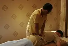 Le terme n'est défini au niveau législatif que pour fixer le cadre d'intervention des masseurs-kinésithérapeutes français (équivalent de l'association des massothérapeutes et des physiothérapeutes internationaux) par l'article R.4321-3[35] du code de la santé publique (CSP) : « On entend par massage toute manœuvre externe, réalisée sur les tissus, dans un but thérapeutique ou non, de façon manuelle ou par l'intermédiaire d'appareils autres que les appareils d'électrothérapie, avec ou sans l'aide de produits, qui comporte une mobilisation ou une stimulation méthodique, mécanique ou réflexe de ces tissus ». Ceci est à placer dans le contexte de l'article R.4321-1 qui le précède et place la kinésithérapie spécifiquement dans le cadre d'interventions rééducatives : « La masso-kinésithérapie consiste en des actes réalisés de façon manuelle ou instrumentale, notamment à des fins de rééducation, qui ont pour but de prévenir l'altération des capacités fonctionnelles, de concourir à leur maintien et, lorsqu'elles sont altérées, de les rétablir ou d'y suppléer. Ils sont adaptés à l'évolution des sciences et des techniques ».