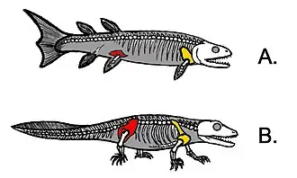 - ↑ Membres ancestraux qui se plient en Z et sont situés de chaque côté du tronc, caractéristiques de la posture tentaculaire chez les Amphibiens du Primaire, les Urodèles et Reptiles actuels.