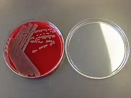 Boîte de Pétri contenant de la gélose au sang sur laquelle sont étalées des colonies de bâtonnets gram-négatifs.