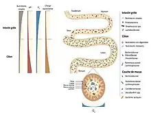 - fonction physiologique : Modifications histologiques, l'épaisseur et le renouvellement de la muqueuse de l'intestin, la taille des villosités et de la bordure en brosse, l'angiogenèse sont corégulés par le microbiote[58] ;