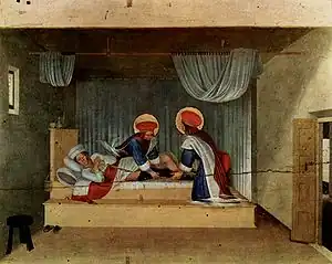 Cependant on a la preuve que sous Louis IX, tous les chirurgiens étaient Maîtres-es-Arts, avaient non seulement une formation, mais aussi le droit d'enseigner et de faire des leçons publiques. Ainsi Henri de Mondeville, chirurgien des rois de France Philippe le Bel et de Louis le Hutin, hérita de leurs leçons, surtout celles de Jean Pitard. On ne pouvait être admis dans cette confrérie et école des Chirurgiens de Paris sans avoir fait ses Humanités et de la philosophie. Au Moyen Âge[16] ceux-ci portaient une robe écarlate, de soie pour les recteurs, de satin, de damas, de taffetas doublée de bleu ou de fourrure de vair ou d'hermine sur le camail et aussi, fourrure sous leur bonnet rond ou carré cramoisi, doublé de bleu, et un chaperon : « moi qui suis bon miège, Que des peaux, sur l'hiver, se fourre » (François Villon)[24]. Côme et Damien sont toujours représentés couverts de ce bonnet écarlate doublé d'hermine. Se construisit aussi la collégiale Saint-Cosme de Luzarches : « Elle compta sur ses diptyques plus d'un personnage considérant, Charles le Régent, Louis XIII, Louis XIV. La faculté de médecine de Paris était représentée au pèlerinage par une délégation de praticiens lesquels soignaient les pèlerins en retour de certaines onctions. « Nous avons ordonné, dit un chapitre de 1413, que le prévôt fasse diligence pour le fait des mires de Paris et d'ailleurs qui reçoivent cens et offrandes faites aux saints de céans et n'en rapportent aucune chose. » Les mires exerçaient publiquement leur art le et le , fête de la saint Simon et Jude, auprès des malades qu'on leur amenait[25].