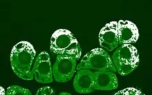 Monoxyde d'azote (en blanc) rendu visible dans des cellules de conifères, par l'utilisation de DAF-2 DA (diacétate de diaminofluorescéine).