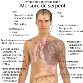 La plupart des morsures, par un serpent venimeux ou non, ont des effets locaux. On observe ainsi une douleur et une rougeur dans 90 % des cas, bien que cela dépende de l'endroit du corps touché[4]. Les morsures de vipéridés et de certains cobras peuvent être très douloureuses, avec un œdème important des tissus touchés dans les cinq minutes qui suivent[6]. La zone touchée peut également saigner et se cloquer, se nécroser parfois. D'autres symptômes liés aux morsures de crotales et de vipéridés sont la léthargie, le saignement, un affaiblissement de la victime, des nausées et des vomissements[4],[6]. Certains symptômes mettent plus en danger la vie de l'individu mordu qui peut développer de l'hypotension, de la tachypnée, une importante tachycardie, une grave hémorragie interne, ou des problèmes aux reins et aux poumons[4],[6]