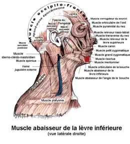 Muscle abaisseur de la lèvre inférieure (en rouge).