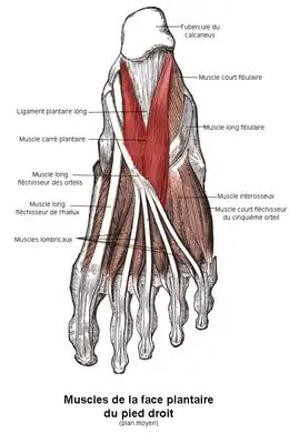 Les deux chefs se dirigent vers l'avant et fusionnent pour former un corps musculaire aplati compris entre le muscle court fléchisseur des orteils en dessous et le ligament calcanéo-cuboïdien plantaire au-dessus.