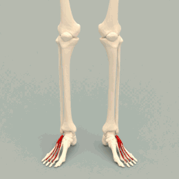 Les tendons fusionnent avec le bord latéral de chaque tendon correspondant du muscle long extenseur des orteils au niveau des deuxième, troisième et quatrième articulations métatarso-phalangiennes.