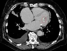 Coupe scanographique axiale montrant des calcifications aux extrémités des muscles papillaires de la valve mitrale du cœur (cercle rouge).