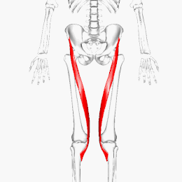 C'est un long muscle rubané aplati en forme de « S » italique allongé qui relie l'os coxal au tibia..