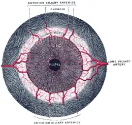 Ces fibres passent par le nerf oculomoteur (CN III), synapse dans le ganglion ciliaire, puis pénètrent dans l'œil par les nerfs ciliaires courts .[réf. nécessaire] . Les nerfs ciliaires courts courent ensuite vers l'avant et percent la sclère à l'arrière de l'œil, voyageant entre la sclère et la choroïde pour innerver le muscle du sphincter de l'iris.