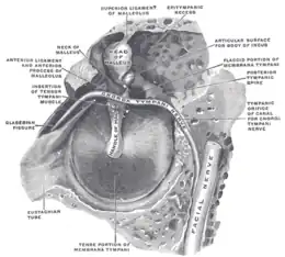 Le muscle tenseur du tympan est fixé entre l'os sphénoïde et la partie supérieure du marteau à l'intérieur de l'oreille moyenne. Il est innervé par une branche du nerf mandibulaire.