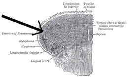 Le muscle se termine dans le tissu fibreux sous-muqueux sur les faces latérales de la langue.
