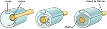 Sur un axone myélinisé, on peut observer la succession, après le segment axonal initial, de l'alternance de segments axonaux enrobés de myéline (les internœuds), et de segments amyéliniques correspondant aux nœuds de Ranvier. Dans le système nerveux central, un oligodendrocyte myélinise plusieurs internoeuds situés sur des axones différents tandis que dans le système nerveux périphérique, une cellule de Schwann myélinise un unique internœud. Aux extrémités de chaque internœud, se situe une zone appelée paranœud, où la gaine de myéline s'insère sur l'axone.