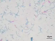 Co-infection de Mycobacterium bovis, en rose, avec des Streptocoques (S. mutans) en bleu (microscopie optique après coloration ZN)