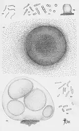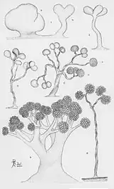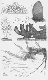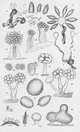 Croquis de diverses espèces de myxobactéries par Roland Thaxter en 1892 : Chondromyces crocatus (figs. 1-11), Stigmatella aurantiaca (figs. 12-19 et 25-28), Melittangium lichenicola (figs. 20-23), Archangium gephyra (fig. 24), Myxococcus coralloides (figs. 29-33), Polyangium vitellinum (figs. 34-36) et Myxococcus fulvus (figs. 37-41). Thaxter a été le premier taxonomiste à reconnaître la nature bactérienne des myxobactéries. Auparavant, elles étaient (mal) classifiées dans le groupe des Fungi imperfecti.