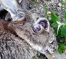La myxomatose est une maladie virale des lagomorphes due à un poxviridé, très souvent mortelle. Elle atteint tout particulièrement les lapins de garenne sauvages et les lapins domestiques, mais ne touche que très rarement les lièvres[1]. Transmise par l'intermédiaire d'Arthropodes vecteurs (puces, moustiques, simulies), elle apparaît sous sa forme classique nodulaire, caractérisée par la présence de pseudotumeurs cutanées, les myxomes. Plus rarement, elle peut aussi être transmise par voie aérienne, sans vecteur, et apparaître sous une forme respiratoire anodulaire. Elle n'est transmissible ni aux humains ni aux autres animaux.