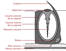 Le cnidocyste, partie globuleuse de la cellule urticante correspondant à la vacuole, est parfois distingué du nématocyste, filament creux enroulé en forme de harpon bardé d'épines, entouré en spirale et qui baigne dans cette vacuole[1]. Ce filament est torsadé plus de cent fois autour de son axe pour se loger dans le cnidocyste, cellule qui fait de 3 à 10 µm de diamètre en moyenne. L'éversion en doigt de gant de ce filament le fait s'allonger et atteindre 200 à 850 µm de longueur[2].