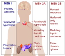 La néoplasie endocrinienne multiple de type 1 ou syndrome de Wermer est caractérisée par un adénome parathyroïdien, une tumeur hypophysaire ainsi qu'une tumeur entéro-gastrique dans la plupart des cas[réf. nécessaire]. Sa prévalence est de 1 à 9 cas sur 100 000.