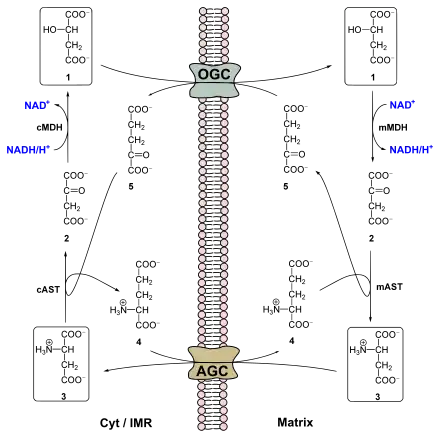 La membrane mitochondriale interne étant imperméable aux coenzymes telles que le NADH, celui traverse cette membrane de façon indirecte, à travers un échange de quatre métabolites rendu possible par un système de quatre enzymes — deux dans le cytosol et deux isoformes des précédentes dans la matrice mitochondriale — et deux antiports (perméases) de la membrane mitochondriale interne :