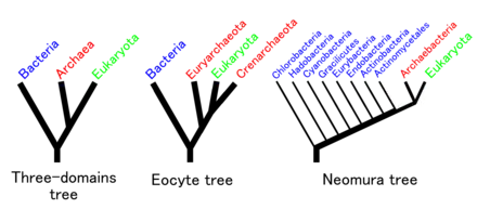 Carl Woese a introduit l'idée que l'ensemble de la vie se répartit en trois domaines fondamentaux : les Bactéries, les Archées et les Eucaryotes, se différenciant les uns des autres sur le plan moléculaire[4]. Il considérait que ces trois domaines s'articulaient à la base de l'arbre phylogénétique universel de la vie. L'analyse moléculaire a montré que les eucaryotes et les archées étaient plus proches entre eux que des bactéries. À titre d'exemple, on peut citer l'utilisation commune de cholestérol et protéasomes, qui sont des molécules complexes ne se trouvant pas dans la plupart des bactéries. Ainsi, il a estimé qu'il y avait deux branches principales dans l'arbre phylogénétique de la vie : une lignée pour les Bactéries et une lignée commune aux Archées et aux Eucaryotes.