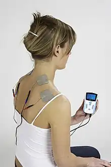 On parle également de neuromodulation lorsque la neurostimulation est appliquée au niveau médullaire[3]. La neurostimulation est appliquée au moyen de neurostimulateurs implantables (neurostimulation percutanée p-NS) de type pacemakers ou au moyen de dispositifs externes (neurostimulation transcutanée t-NS), avec des appareils de type TENS qui stimulent via des électrodes (auto-collantes) par voie transcutanée, aussi bien au niveau du corps qu'au niveau crânien (appareils de type Cefaly).