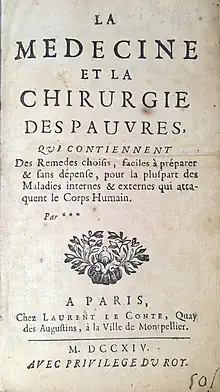Il s'agit d'un livret in-octavo de 500 pages environ[1]. Il est intitulé La Médecine et la Chirurgie des Pauvres, qui contient des remèdes choisis, faciles à préparer & sans dépense, pour la plupart des maladies internes & externes qui attaquent le corps humain. ». La première édition date de 1714, à Paris, chez Laurent Le Comte.