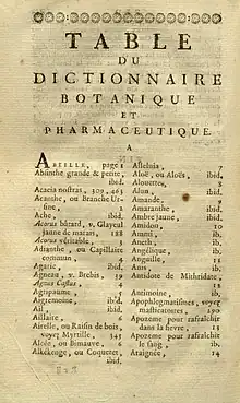 L'ouvrage de Dom Alexandre est intitulé : Dictionnaire Botanique et Pharmaceutique, contenant les principales propriétés des Minéraux, des Végétaux, et des Animaux d'usage, avec les préparations de pharmacie, internes et externes, Les plus usitées en Médecine & en Chirurgie, Le tout tiré des meilleurs Auteurs, sur-tout Modernes (Première édition : 1716, en ligne). L'ouvrage connait 24 éditions, de 1716 à 1846[4].