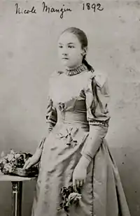 - ↑ Le curieux uniforme que l'on voit porté par Nicole Girard-Mangin sur les photos est dû au fait que l'armée française n'avait pas prévu d'uniforme d'officier pour les femmes ; en conséquence, elle a porté pendant toute la guerre un uniforme d'officier féminin britannique (source : « Nicole Mangin au cœur de la Grande Guerre » sur Verdun-Meuse.fr) ainsi qu'une casquette plate d'officier britannique.