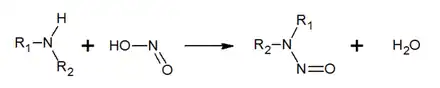 Les nitrosamines sont formées par une réaction de nitrosation entre des nitrites ou des nitrates et des amines ou des amides. La molécule finale correspond à l'addition d'un radical nitroso et le produit formé n'est stable qu'avec les amines secondaires.