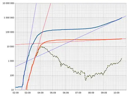 Pour une croissance exponentielle, en début d'épidémie (où tout part d'une valeur négligeable), peut être interprété indifféremment comme le nombre cumulé de diagnostics (y compris les individus qui se sont rétablis) ou le nombre actuel de cas d'infection ; le taux de croissance logarithmique est le même pour l'une ou l'autre définition. En pratique, en début d'épidémie, la lecture est plus sûre sur le nombre cumulé de cas, qui porte sur des quantités plus importantes et a de ce fait des fluctuations moins importantes. En revanche, pour apprécier des pentes instantanées en cours d'épidémie, la mesure n'est généralement possible que sur le nombre de nouveaux cas.