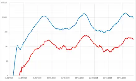 On distingue bien les différents pics épidémiques (juillet 2020, octobre 2020, février 2021, juillet 2021) avec leurs pentes symétriques de croissance et de décroissance.