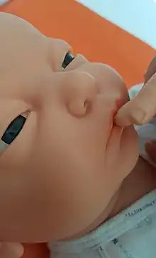 Quand on introduit un objet ou un doigt dans la bouche du nouveau-né, il déclenche automatiquement le mouvement de succion[19],[18].