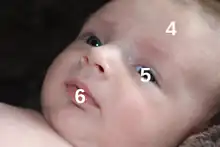 Ses yeux sont bleu/gris, l'iris prenant sa couleur définitive à six mois[6]. Sur la lèvre supérieure du nouveau-né peut apparaître une petite ampoule due à la succion[7].