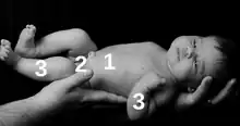 Le pédiatre place son doigt dans la paume du bébé, ce qui provoque une fermeture des doigts puis un agrippement tellement fort que l'on peut parfois soulever le bébé avec les deux mains[18].