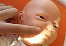 Sa tête est recouverte d'un duvet appelé le lanugo qui disparaît au bout de quelques semaines[5]. Les os de son crâne ne sont pas encore soudés[8].