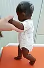 • le tronc : il ne se tient pas droit, il a le dos rond. Le nouveau-né présente une cyphose globale du dos due à une absence totale de la musculature du dos[10]