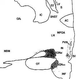 Le noyau supraoptique humain (SON, composants dorsolatéral et ventromédial) dans cette section coronale est indiqué par les zones ombrées. Les points représentent les neurones de la vasopressine (AVP) (également observés dans le noyau paraventriculaire, PVN). La surface médiale (à droite) est le 3e ventricule (3V)