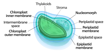 - 1 2 (en) John M. Archibald et Christopher E. Lane, « Going, Going, Not Quite Gone: Nucleomorphs as a Case Study in Nuclear Genome Reduction », Journal of Heredity, vol. 100, no 5, , p. 582-590 (lire en ligne) DOI 10.1093/jhered/esp055
