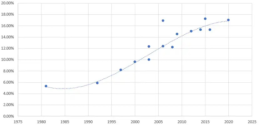 | 65+ | 11,4 % | 13,6 % | 15,4 % | 16,55 % | 18,6 % | 18 % | 18,5 % | 20,65 % | 19,9 % |