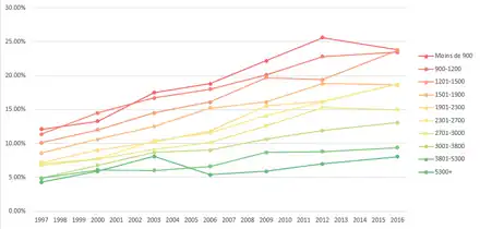 | Modèle:Décile 4 | 8,6 % | 10,6 % | 12,5 % | 15,2 % | 16,1 % | 18,8 % | 5,35 % |