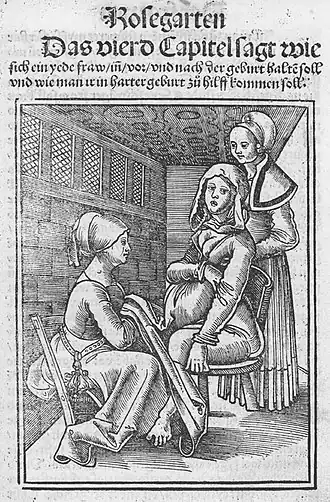 Une femme donnant naissance sur une chaise d'accouchement, Eucharius Rösslin, 1515. La parturiente, soutenue par une compagne, accouche à couvert. La sage-femme est assise sur un tabouret bas pour recevoir l'enfant.