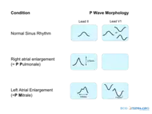 Les ondes P maximales (> 0,25 mV) suggèrent une hypertrophie auriculaire droite, cœur pulmonaire (rythme P pulmonaire)[1], mais ont une faible valeur prédictive (~ 20 %)[2].