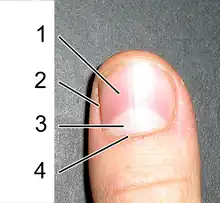 (1) Ongle ; (2) paronychium ; (3) Lunule ; (4) Eponychium (Cuticule).