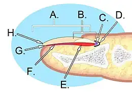A. plateau unguéal ; B. lunule ; C. racine ; D. sinus ; E. matrice ; F. lit ; G. hyponychium ; H. bord libre.