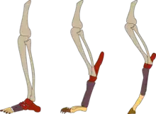 De gauche à droite : plantigradie chez les primates dotés de griffes à ongles, digitigradie chez des vertébrés munis de griffes, onguligradie chez les ongulés munis de griffes à sabots.
