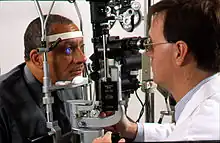 Une lampe à fente utilisée avec un microscope binoculaire permet d'examiner un oeil. Octobre 2019.