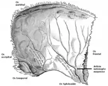 Dans sa partie antérieure , l'artère méningée moyenne marque l'os du sillon de l'artère méningée moyenne qui part du bord inférieur et remonte en se ramifiant vers le bord supérieur dans la fosse pariétale.