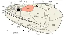 Alors que chez les amphibiens fossiles (Temnospondyls, etc.), un os postorbital est généralement présent, il est complètement réduit chez les amphibiens modernes (Lissamphibia). Chez la grenouille et les amphibiens à queue (Batrachia), la réduction s'accompagne d'un élargissement de l'orbite. Les amphibiens rampants (Gymnophiona) ont un crâne très compact, mais les enquêtes sur les séries ontogénétiques montrent que dans ce groupe également, l'os postorbital n'est pas fusionné avec le squamosal ou tout autre os crânien voisin, mais que cet os n'est pas créé du tout[1].