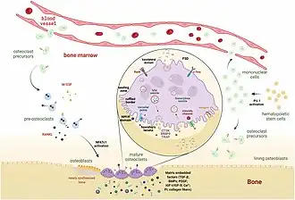 L' ostéoclaste est une cellule géante multinucléée osseuse d’un diamètre de 20 à 100 μm d'origine hématopoïétique, qui se forment à la suite de la fusion de macrophages entraînés par la production de deux cytokines essentielles dérivées du micro-environnement médullaire : le facteur de stimulation des colonies de macrophages (M-CSF acronyme de macrophage colony-stimulating factor) et l'activateur des récepteurs nucléaires. ligand du facteur kappa B (RANKL) [1],[2].